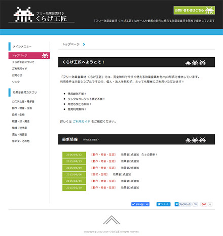 月間PV18万を達成した効果音素材サイトです。ビジュアル面でのデザイン要素は薄いですが、とにかくシンプルで使いやすいサイト設計と検索順位の高さが自慢の趣味サイトです。