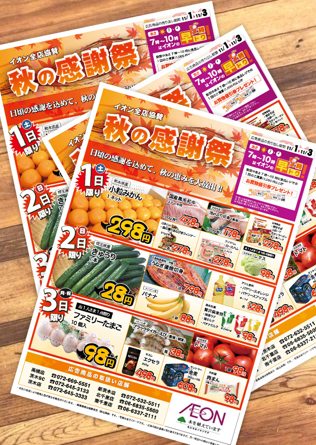 課題用に用意された原稿と商品写真をもとに制作した食品スーパーマーケットのチラシです。 仮想クライアントはイオン株式会社ですが、企業の特色を表現することよりも、チラシらしさや季節感の表現に重点が置かれた課題でした。